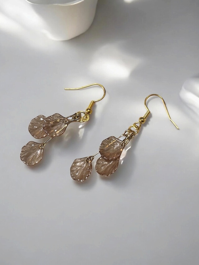 ★ハンドメイド商品です。 ★使用パーツ素材: ・花びら アクリル フロストタイプ ブラウンの吹き付け加工(シルバーの斑点入り・透け感あり) 12×10mm ・メタルパーツ ストレートピン ゴールド (花びらはハンドメイドの吹き付け加工パーツですので色付きは個体差があります。また、水による色落ちの心配はありませんが、アルコール等で拭いた場合は色落ちの可能性がありますのでアルコール等では拭かないようご注意ください) ※写真撮影上、見え方が実際の色と異なる場合がございます。 ※保管時またはご使用後は、ポストまたはイヤリング部分をティッシュや布などでふき取り直射日光や湿気を避け、ケースに入れて保管する事をお勧めします(変色を避けるため) ★金具:フックタイプ:ゴールド(素材:金属) ※落下防止用の樹脂キャッチ付。 ※オプション選択にて各種イヤリング金具やアレルギー対応のその他ピアス金具への交換もできます。 ※金具変更時の各種形は画像にてご確認ください。 ※仕入れ値で形や値段変動有り。 注)金具変更は種類の変更でありカラーが変更になることはございません。 ★サイズ:約5.6㎝(金具含む) ★数量:1組 (重量感レベル:軽い 1・2・3・4・5 重い ➡「1」 ※個人的見解です)