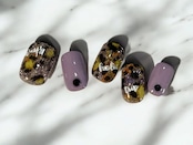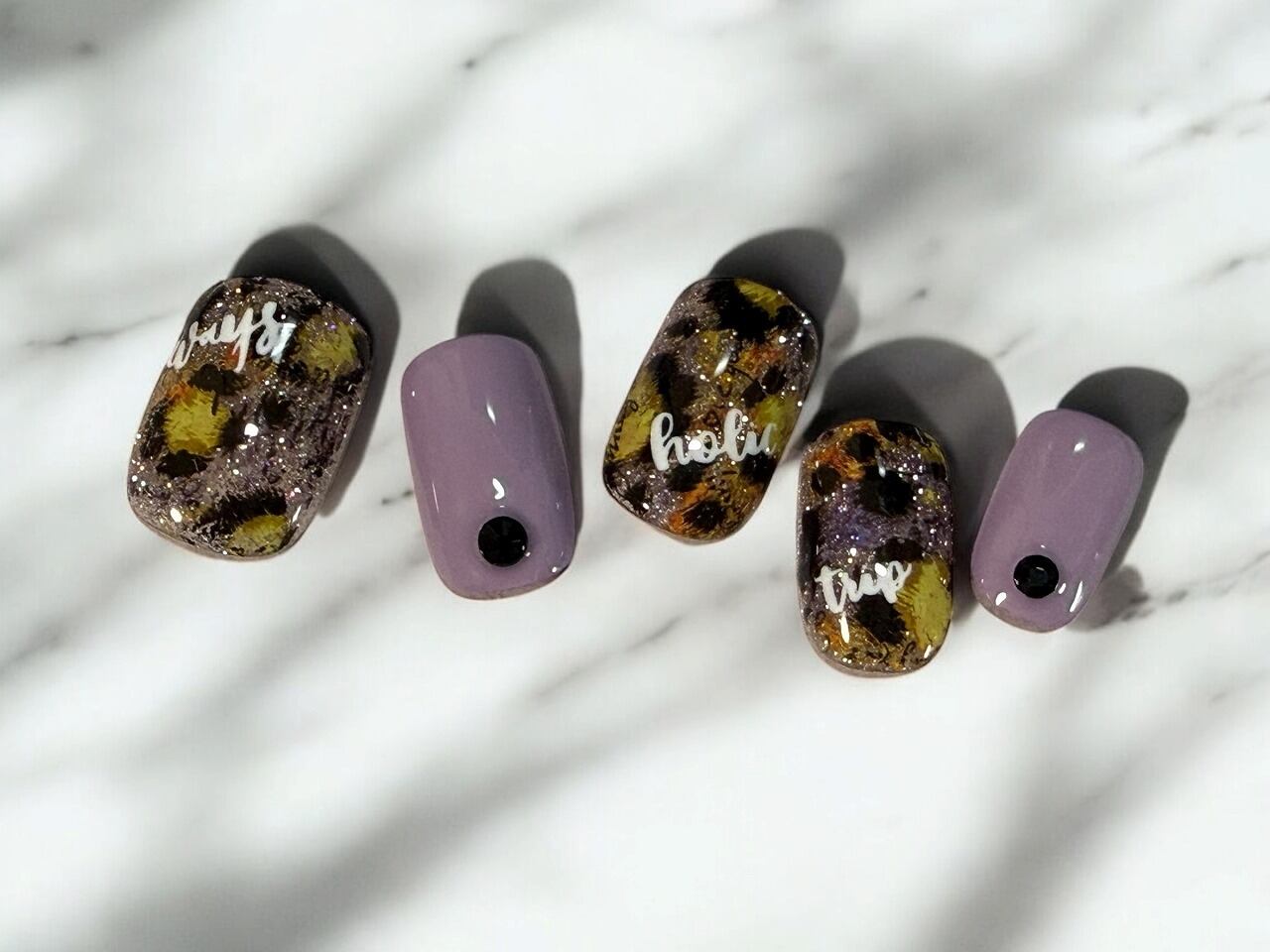 ネイルチップ 【 レオパード柄 】 ゴールドラメ×パープルベース 【スクエアショート】 (ロング~ショートまで選べます)