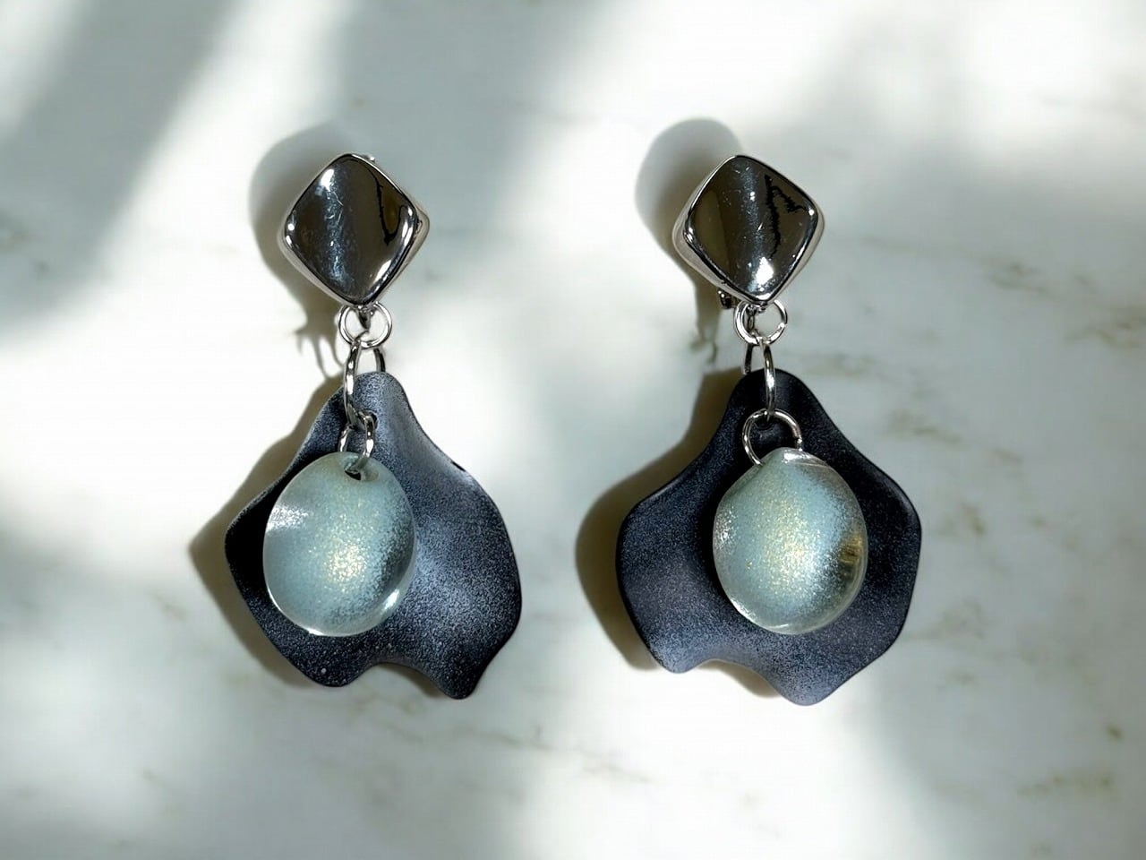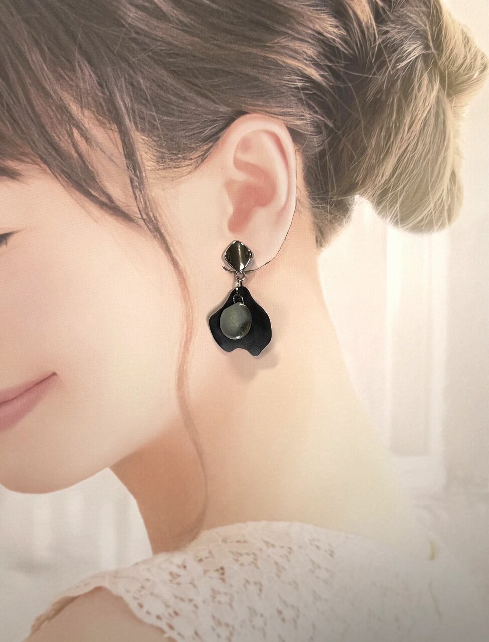 シルバー【デザイン イヤリング】 花びら ブラック×グリーン (イヤリング部分:ニッケルフリー素材)
