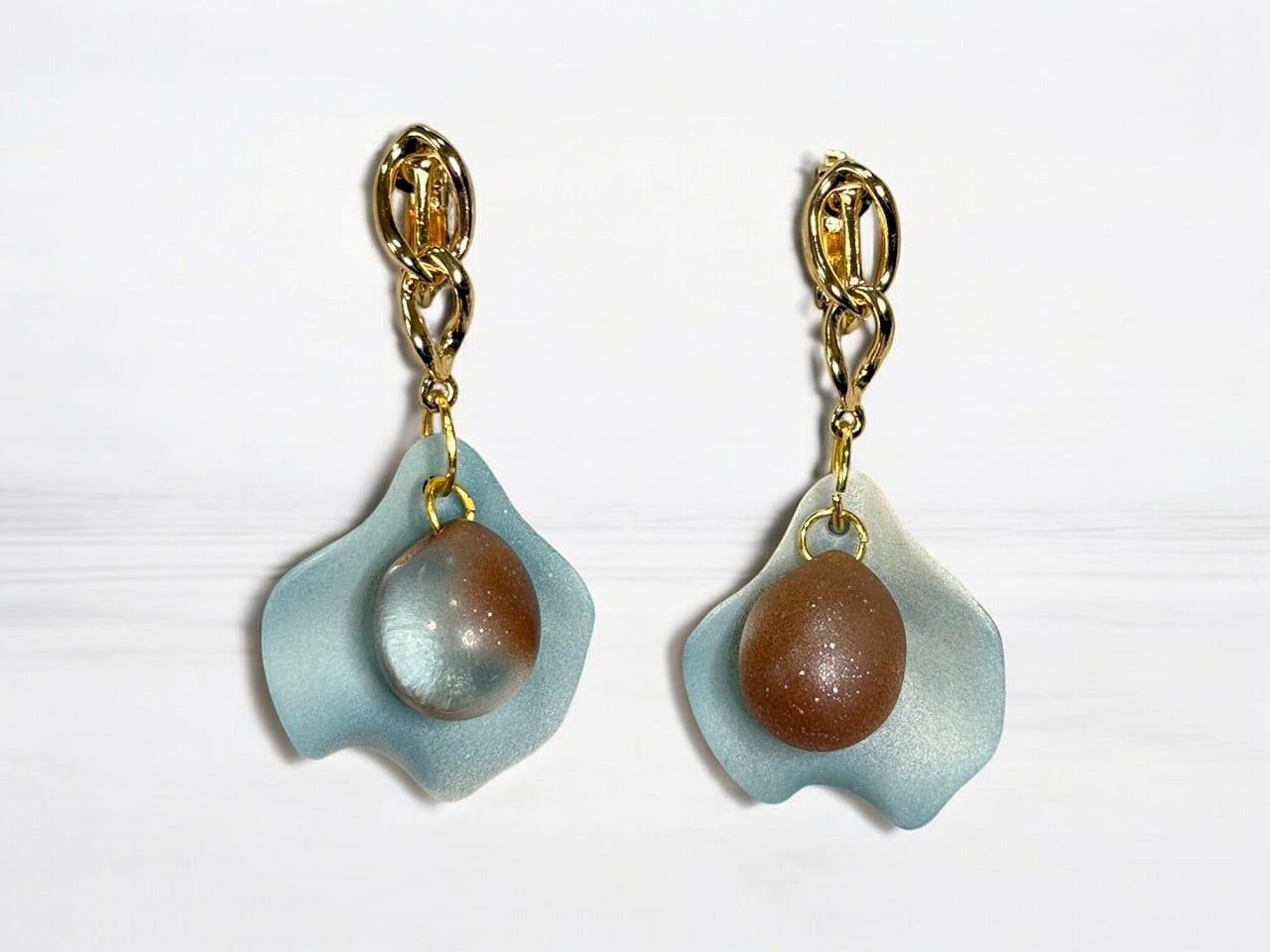 ゴールド【2連チェーン形 イヤリング】 花びら ミントグリーン×ブラウン (イヤリング部分:ニッケルフリー素材)