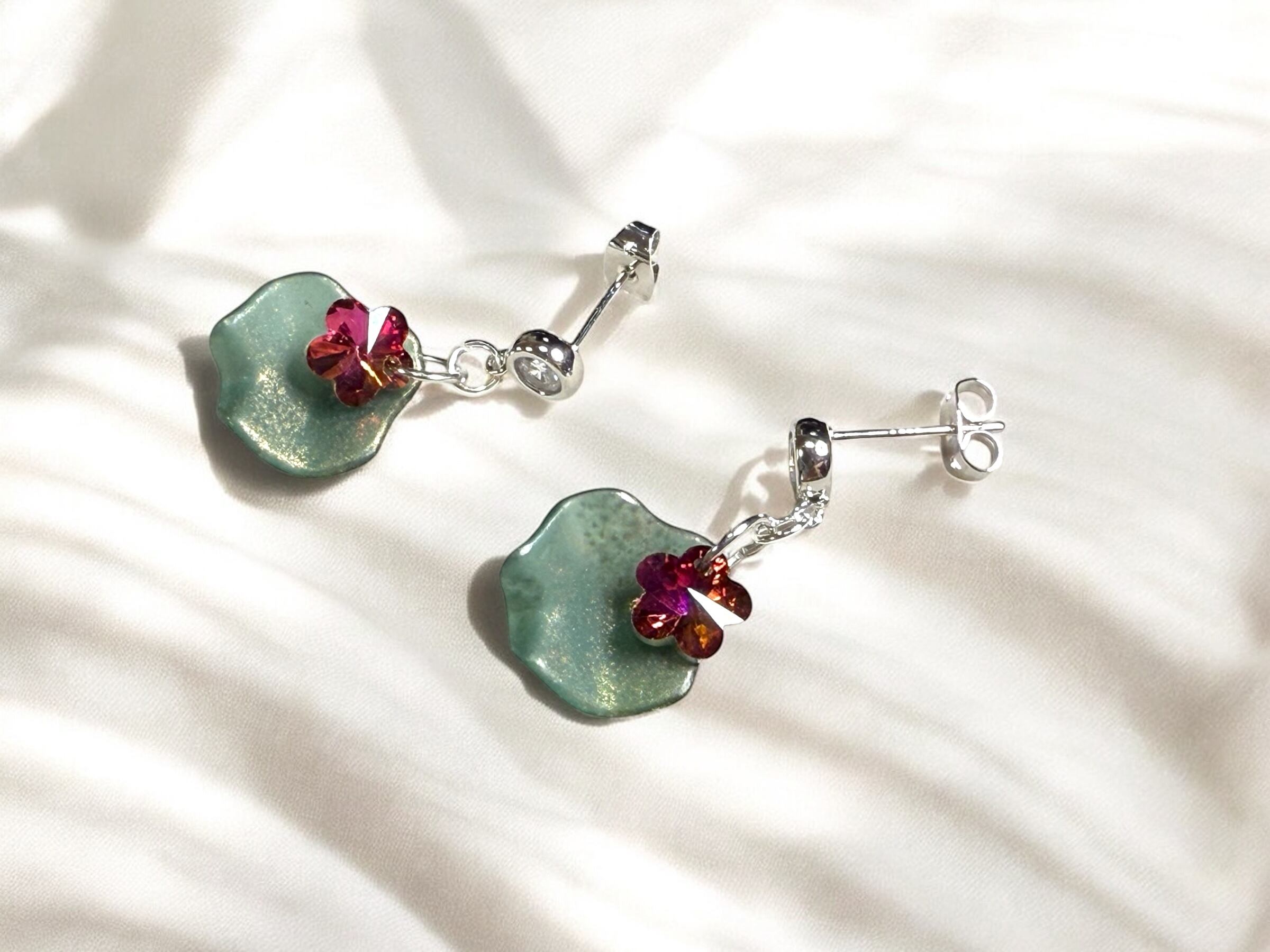 【ラインストーン付 ピアス/シルバー925】 花びら(小) グリーン×ライトレッド(イヤリングやその他ピアス金具にもオプションにて変更出来ます)