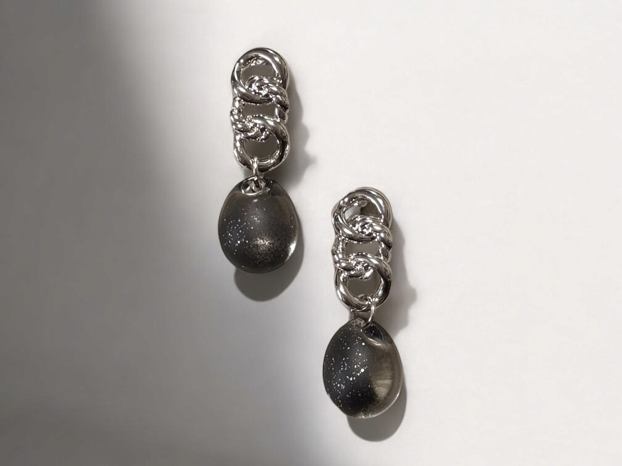 【3連リング形ピアス/サージカルステンレス316】 シルバー×ブラック 【ぷっくりドロップ】1粒アクセサリー
