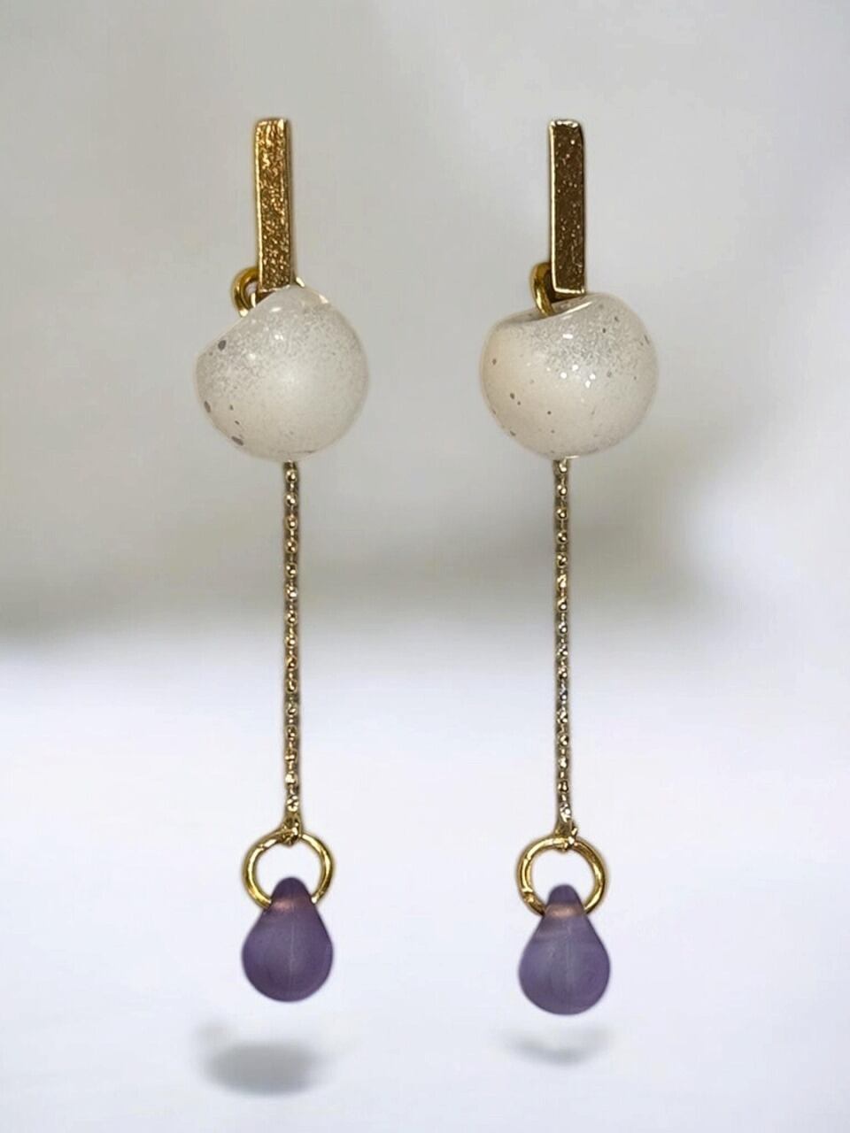【デザインピアス/ステンレス】 ゴールド×ベージュ&パープル 【ロングデザイン】