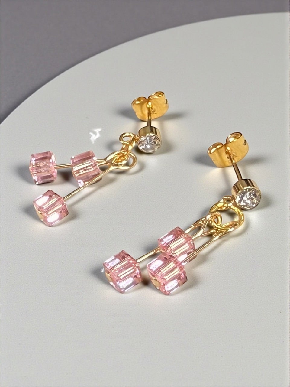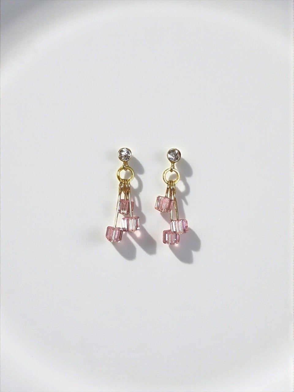 【ストーン付きデザインピアス/ステンレス】 ゴールド×ライトローズ(淡いピンク) 【スモールキューブ】 ※オプションにて樹脂、フックタイプに変更できます。