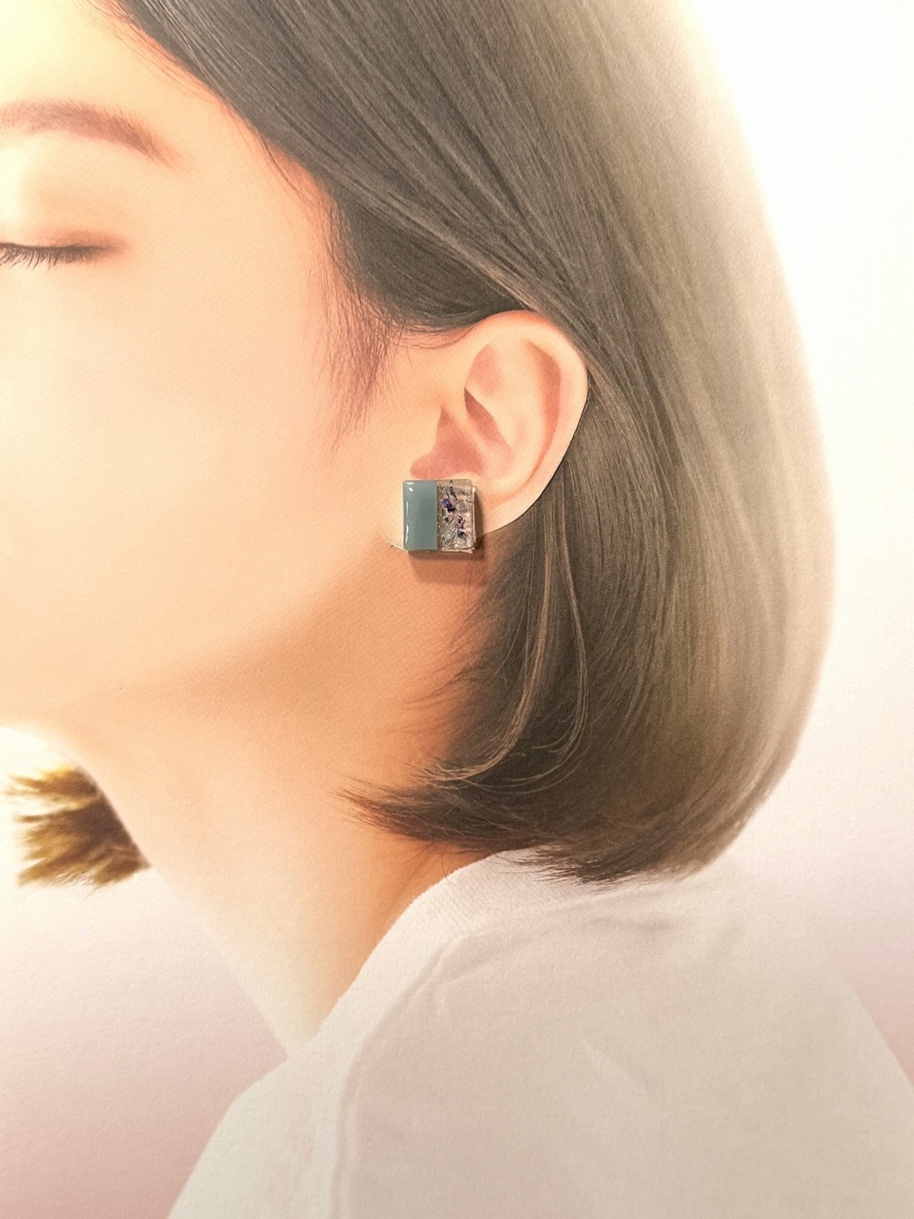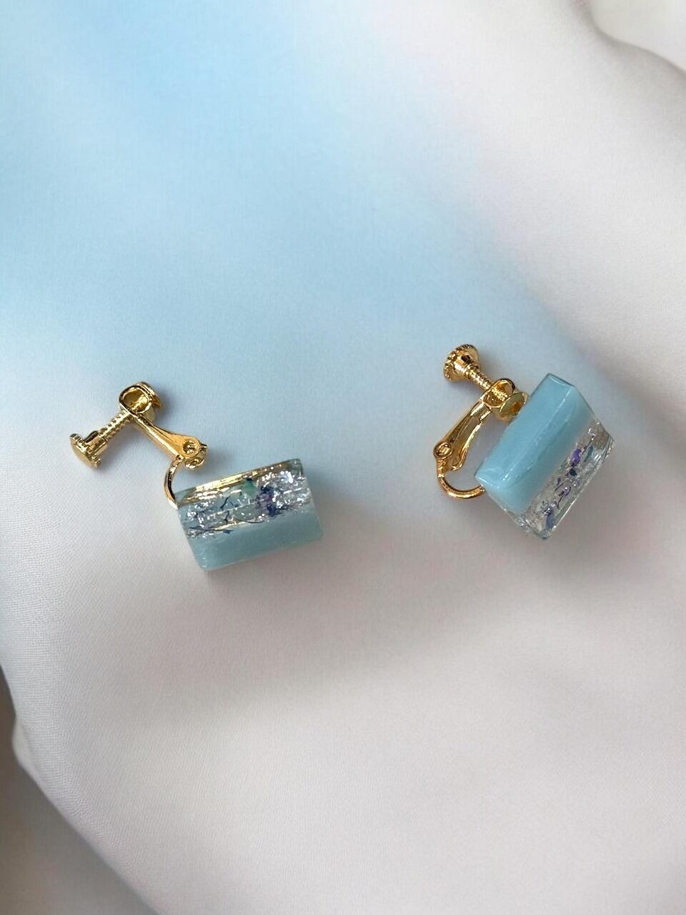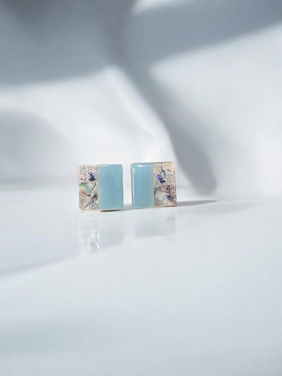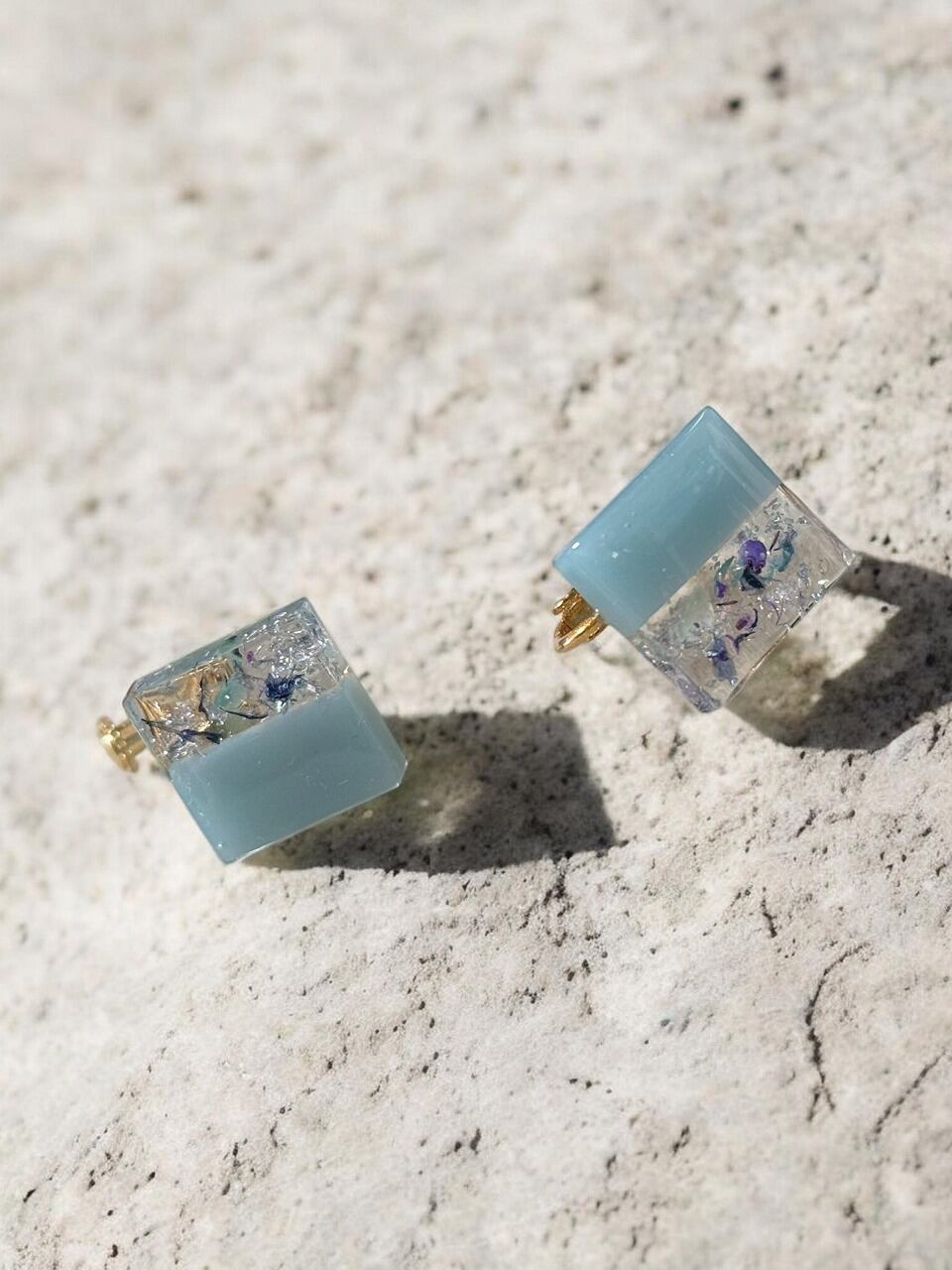 【イヤリング/ねじ式/ニッケルフリー加工】 スクエア 【ターコイズブルー】 ×花びら
