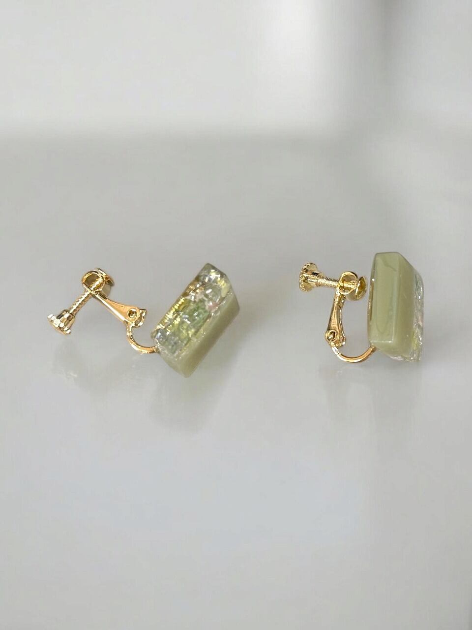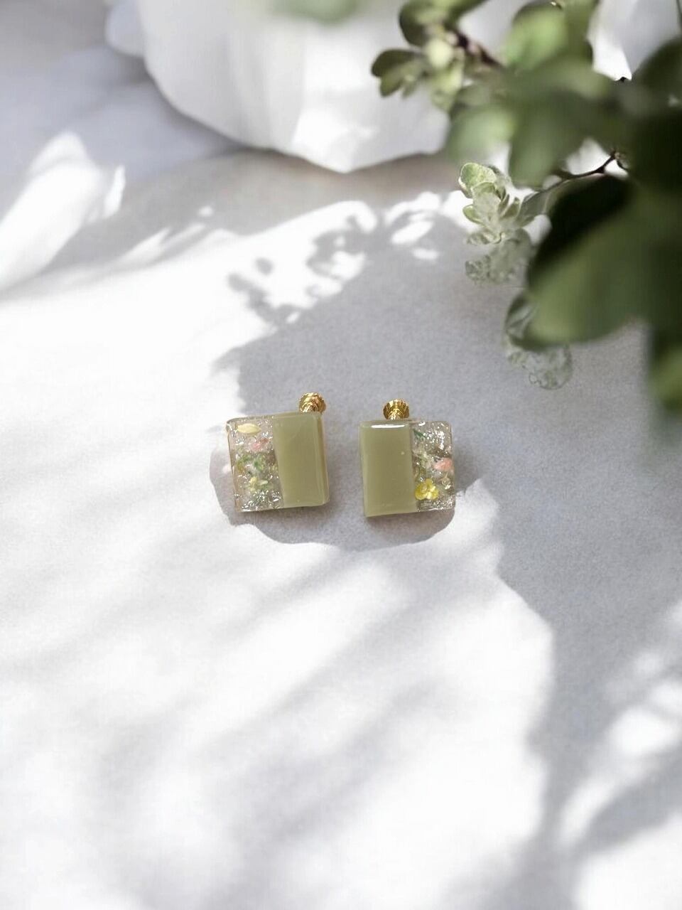 【イヤリング/ねじ式/ニッケルフリー加工】 スクエア 【オリーブグリーン】 ×花びら