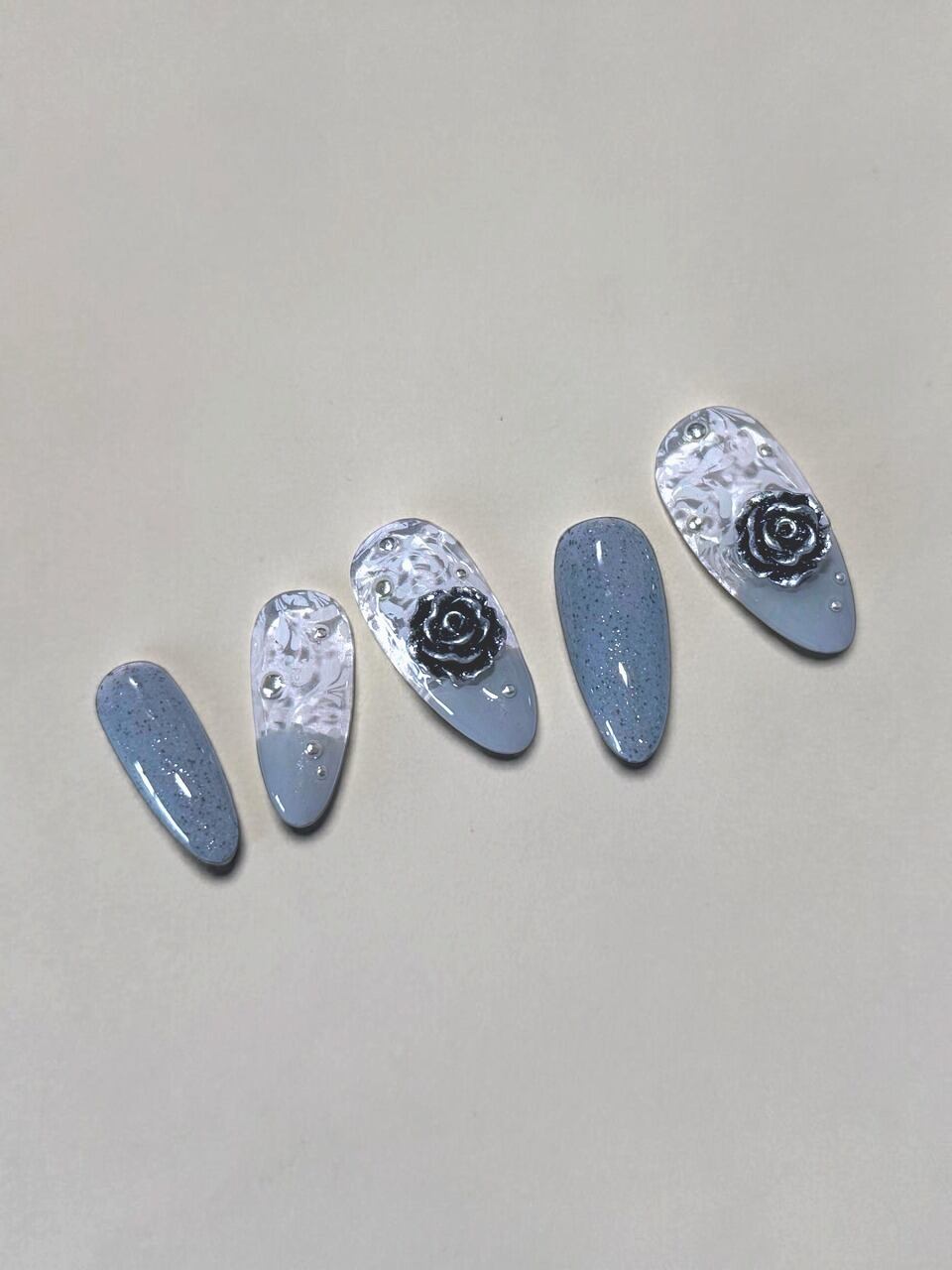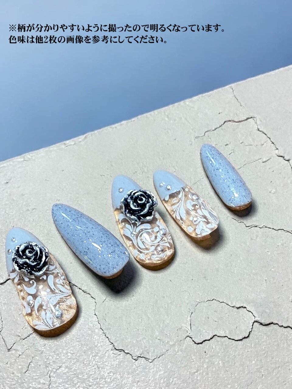 セミオーダーネイルチップ 【 レース柄 】 クリアベース ブルーグレー メタルローズ(薔薇) 【アーモンド ミディアム】 (チップの形選べます)
