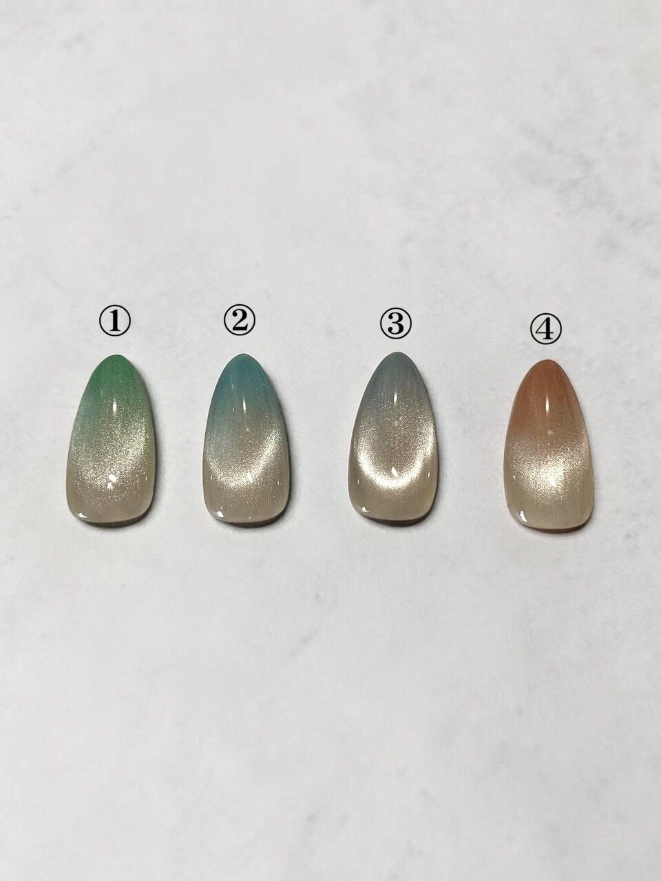 セミオーダーネイルチップ 【 グラデーション×マグネット 】 ベースカラー4色展開(グリーン・ブルー・グレー・ピンク) 【アーモンドミディアム】 (チップの形選べます)
