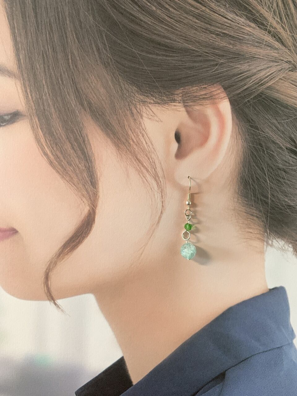ピアス(イヤリング) 【天然石クラック水晶】 グリーン×くるくるピン(シルバー)
