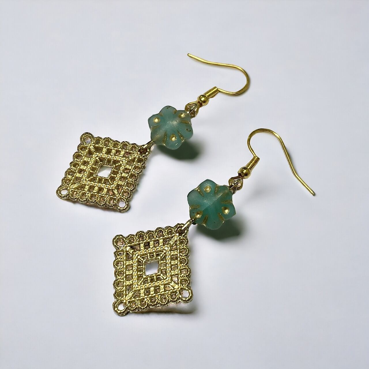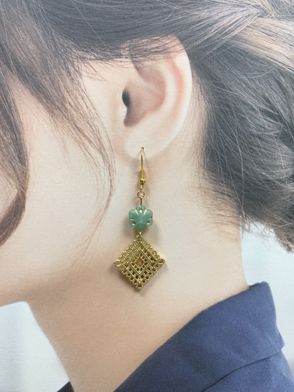 ピアス(イヤリング):レース調透かし彫りチャーム×フラワー (グリーンブルー)