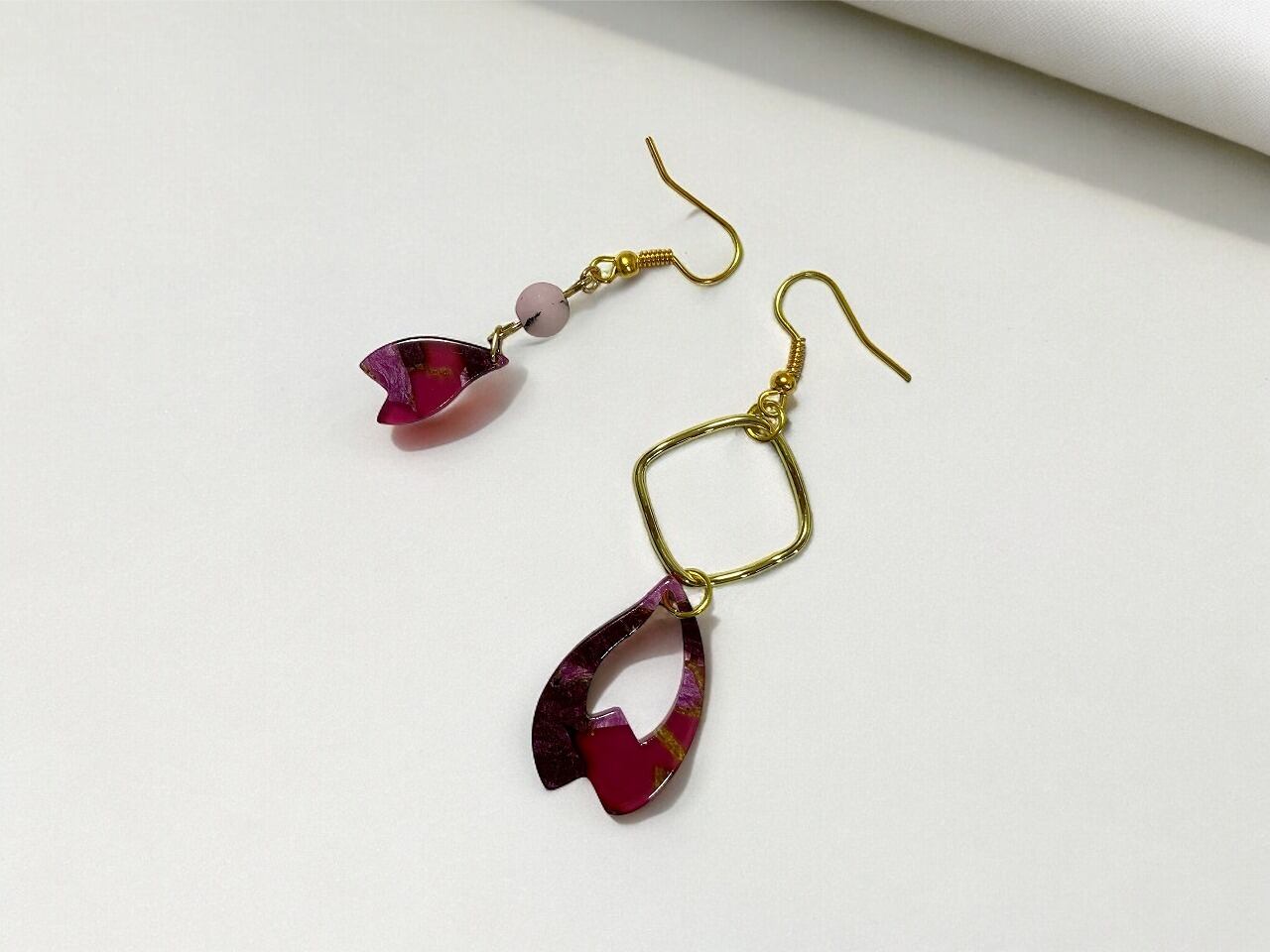 ピアス (イヤリング) 桜 花びら形 天然石 チェリーブロッサムジャスパー アシンメトリー (紫)