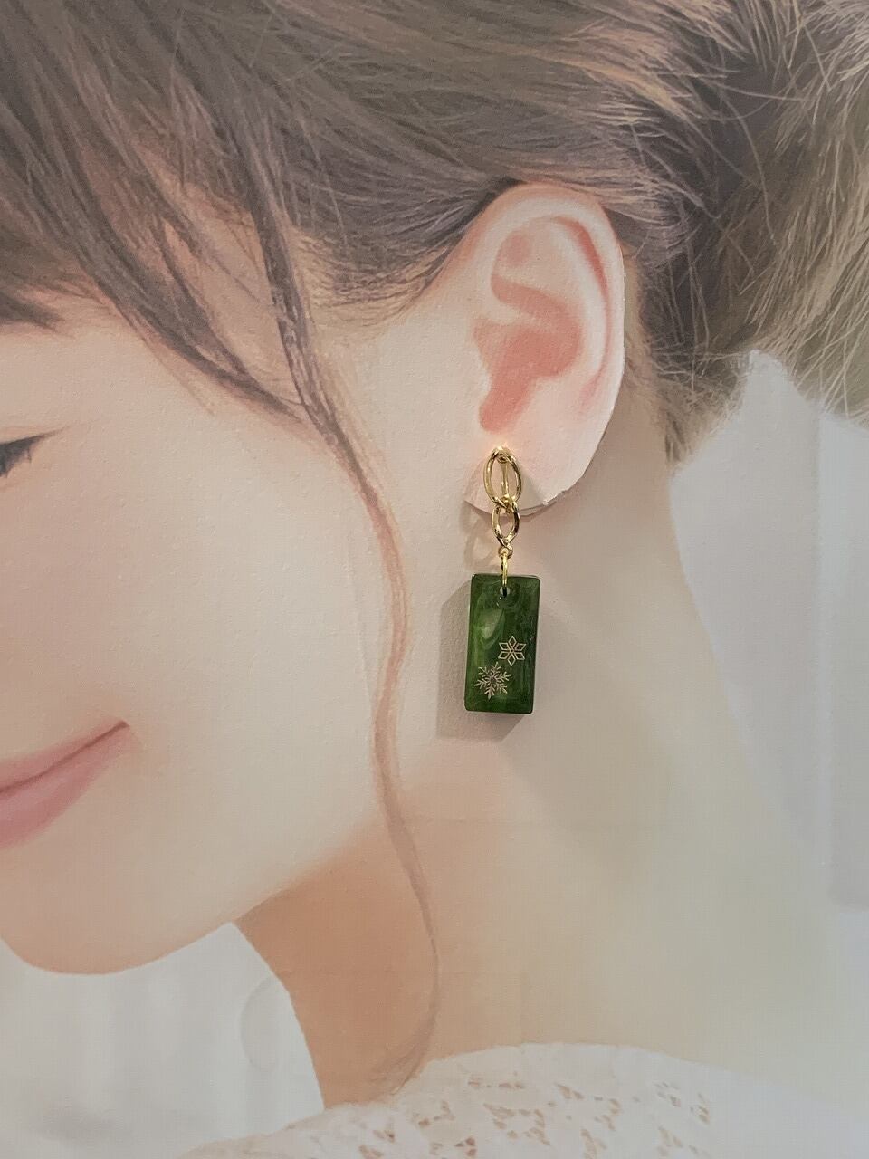 【デザインイヤリング】 雪の結晶 レクタングル グリーン