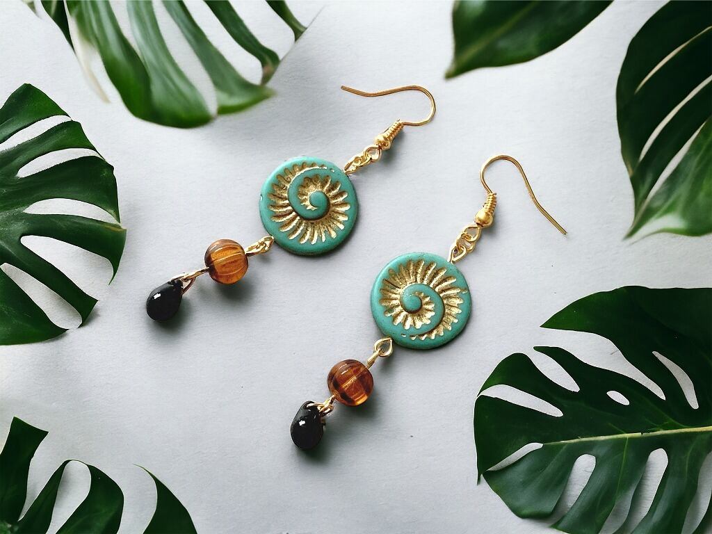 ピアス (イヤリング) ターコイズブルー × アンバー 【化石モチーフ】 大ぶり lot #14-1